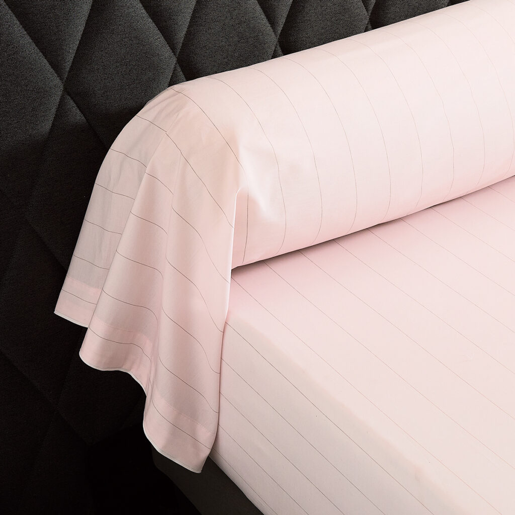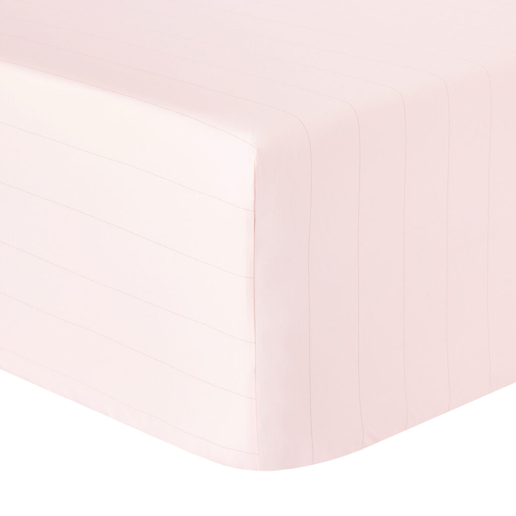 Ce drap housse en percale BIO 80 fils/cm² est imprimé de fines lignes verticales sur fond rose poudré. Sa texture fraîche et respirante est renforcée par un bonnet de 35 cm pour un maintien impeccable. À coordonner avec les autres éléments Nature pour une parure douce et équilibrée.