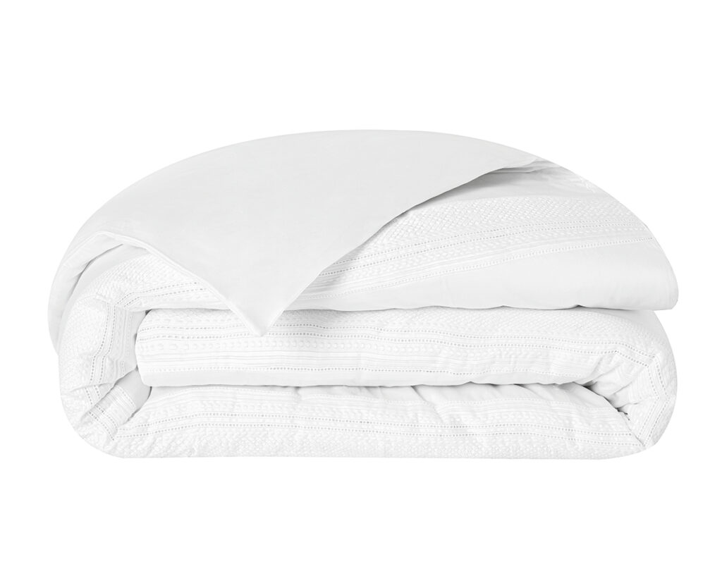 Cette housse de couette conjugue pureté textile, broderie graphique et confort soyeux, pour une chambre sobre et élégante.