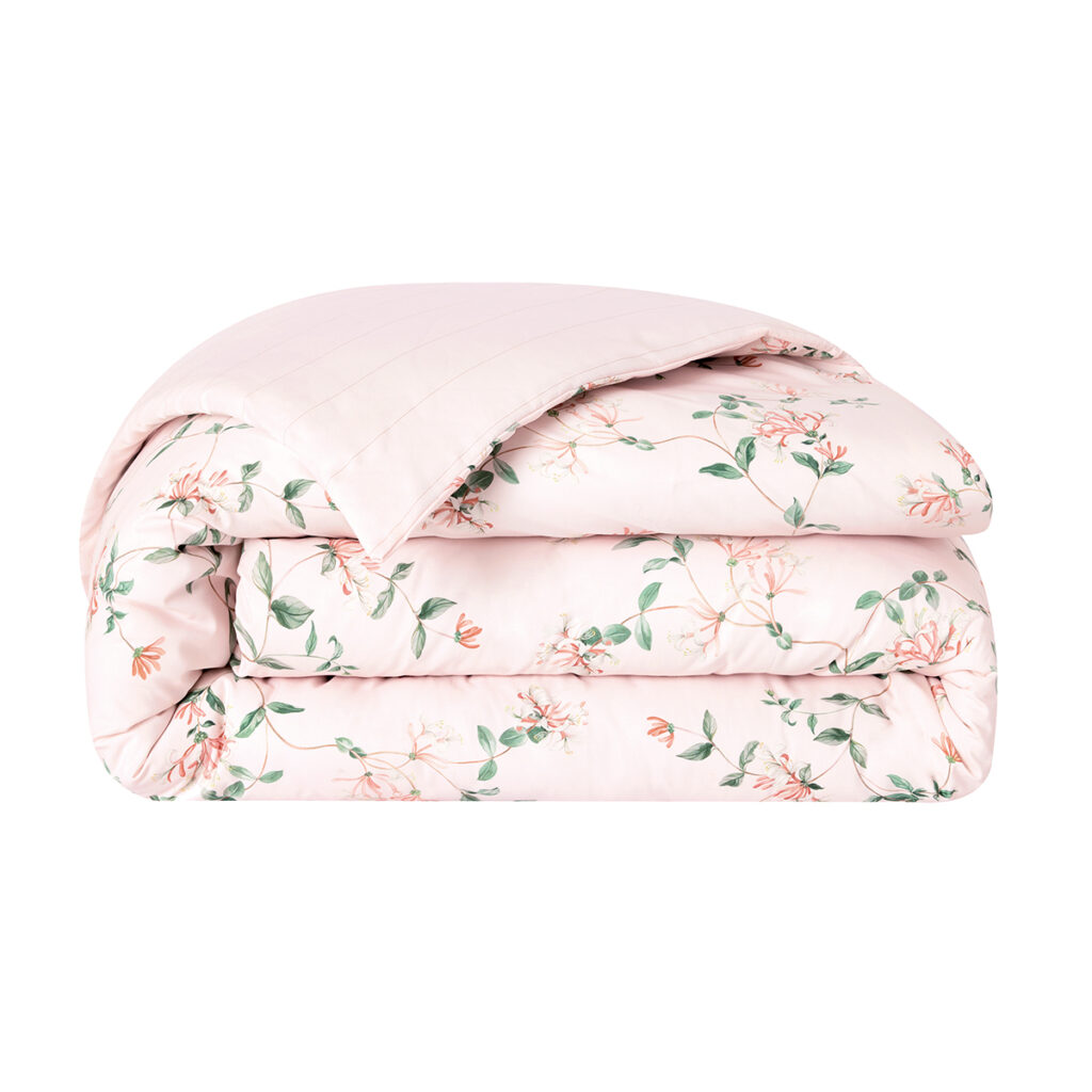 Le modèle Nature rend hommage au chèvrefeuille, dont les tiges torsadées s’épanouissent sur un fond rose poudré. Le recto dévoile un motif fluide et aérien, tandis que le verso, plus épuré, présente de fines rayures verticales dans une nuance douce. Confectionnée en percale de coton BIO 80 fils/cm², cette housse de couette allie confort, élégance et bien-être. Sa finition bouteille assure un maintien optimal et un tombé fluide.