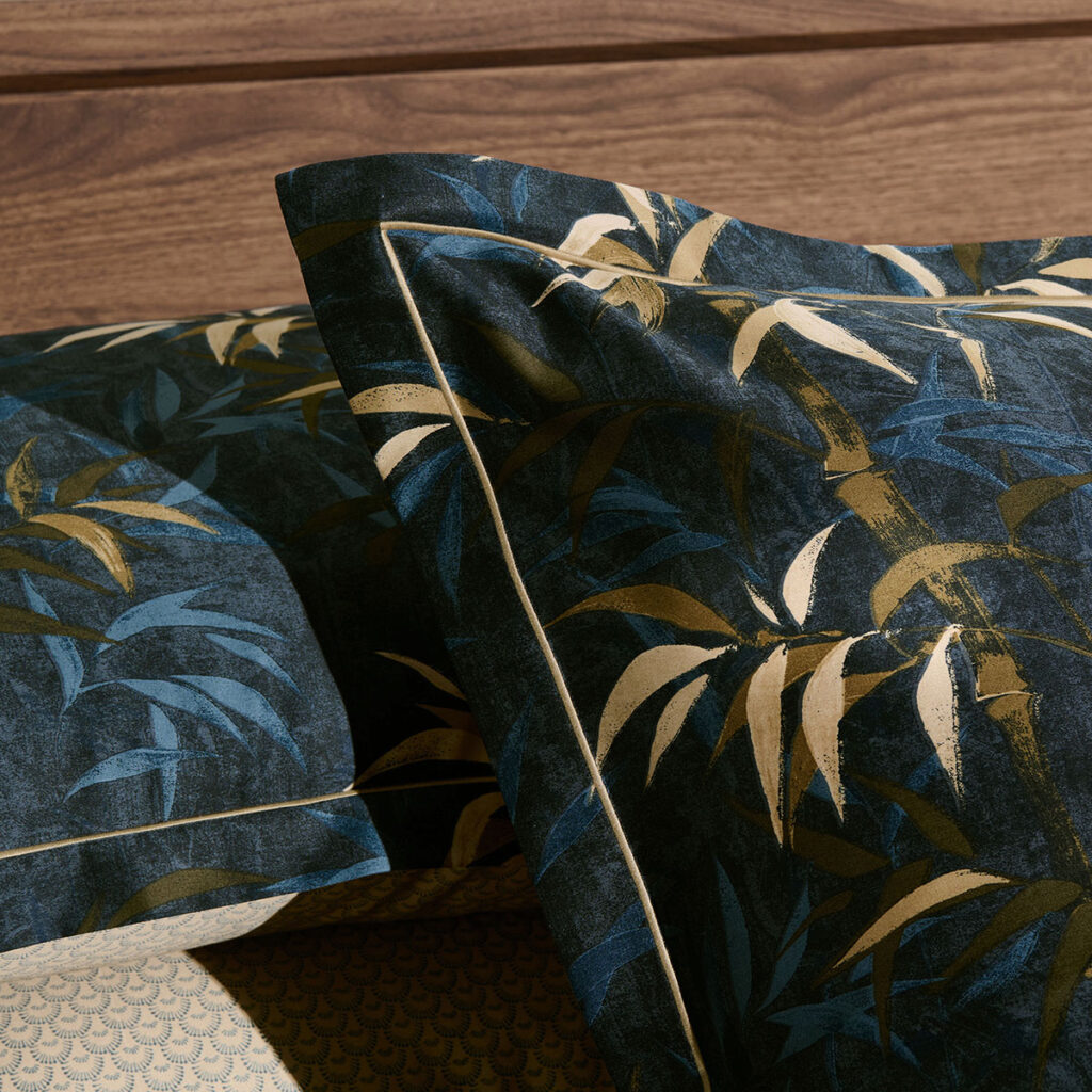 Cette taie conjugue raffinement végétal, finitions couture et matière satinée, pour une chambre à l’élégance méditative.